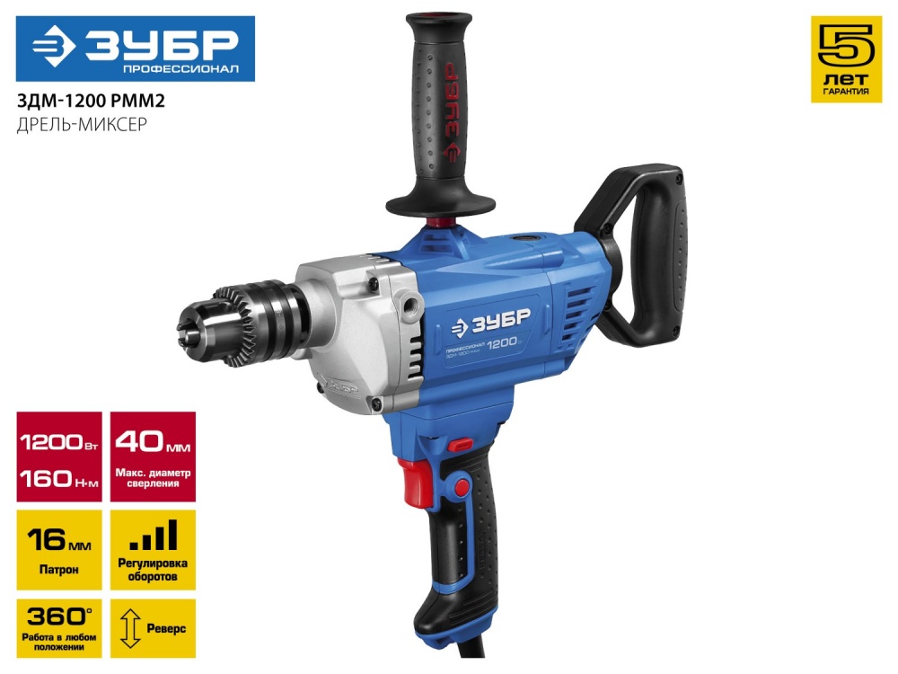 - Дрель-миксер ЗУБР Профессионал ЗДМ-1200 РММ2, 160 Нм, патрон 16 мм, 0-850 об/мин, 1200