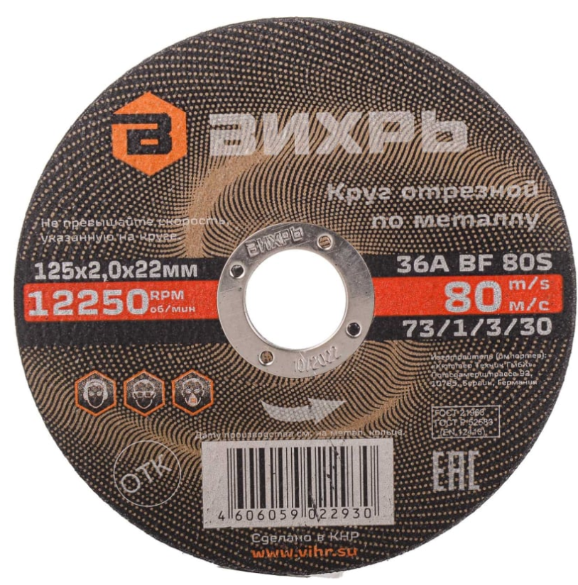 - Круг отрезной по металлу 125х2,0х22 мм Вихрь