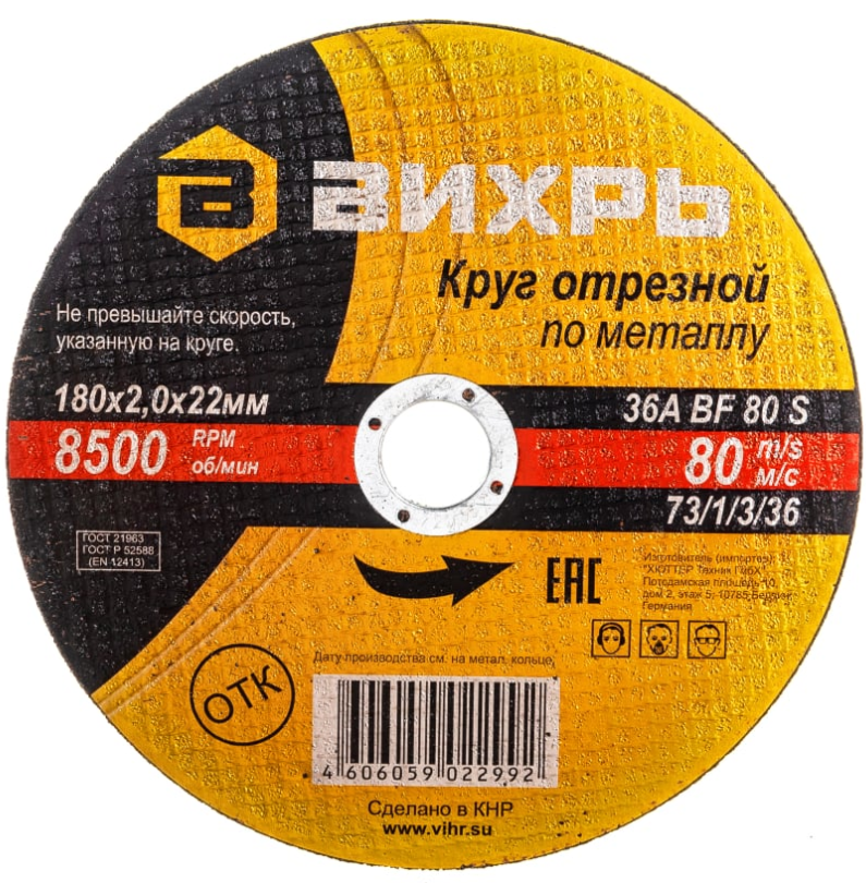 - Круг отрезной по металлу 180х2,0х22 мм Вихрь