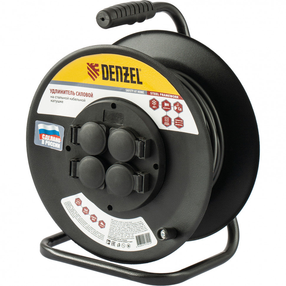 - Удлинитель силовой на стальной катушке, ПВС 3х2,5 мм, 20м, 4 розетки, 16А, тип УХз16// Denzel