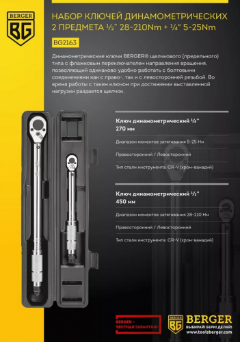 - Набор ключей динамометрических 2 предмета BERGER BG2163 (1/2" 28-210Nm+1/4" 5-25Nm)