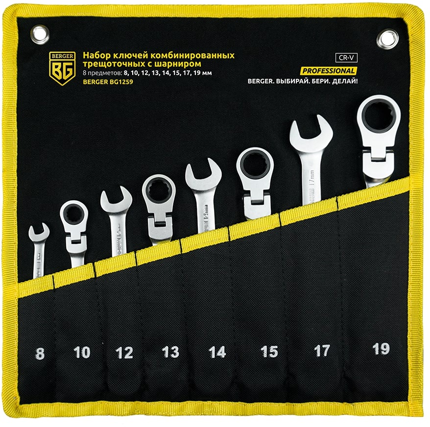 - Набор ключей комбинированных трещоточных с шарниром 8 предметов BERGER BG1259